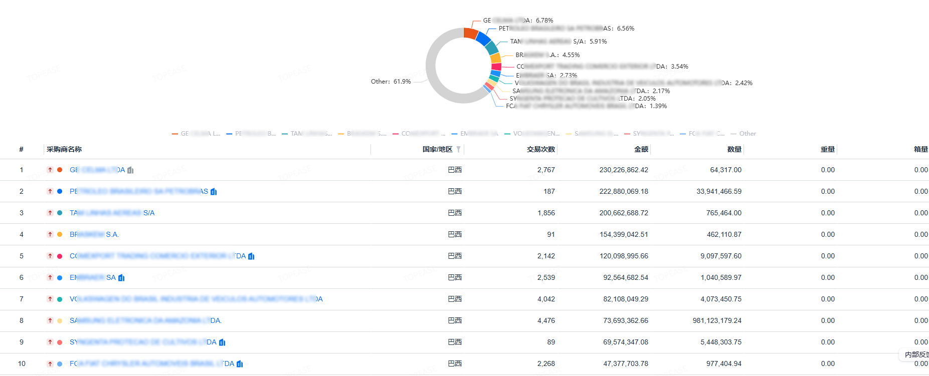 正在全球商业的广漠邦畿中,巴西市场以其奇特的需乞降潜力吸引着浩繁企业。对于但愿开辟巴西市场的企业而言,深切分解巴西进出口数据,并据此制定合适本地市场需求的商业策略至关主要。成为企业挖掘巴西进出口数据价值、制定无效商业策略的得力帮手。特易资讯已上线最新版巴西海关数据,该数据库具有业内独有的口岸数据,产物毛沉数据,单价数据等高达百个数据字段。同时,产物描述更为完整,好比针对产物单价及其的化工类产物,标注了剂量比例、为竞对监测计较量价时供给更多切确的数据参考。