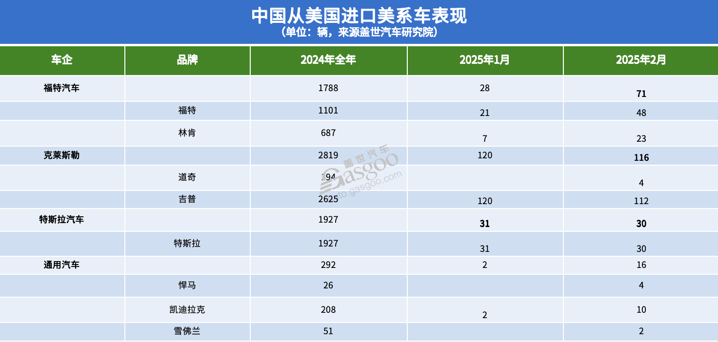500)this.width=500 align=center hspace=10 vspace=10 rel=nofollow/>500)this。width=500 align=center hspace=10 vspace=10 rel=nofollow/数据显示,2024年中国从美国进口的奔跑汽车高达6万辆,占总进口量的六成摆布。据报道,奔跑正在华发卖的GLS、GLE、迈GLS均由其美国阿拉巴马工场出产。受关税壁垒影响,叠加国内合作日益激烈,奔跑已决定将从力进口车型GLE引入国内工场出产。考虑到GLE客岁销量达4。4万辆,这一决策意味着奔跑2026年从美国进口到中国的销量将呈现断崖式下跌。中国从美国进口的另一从力品牌是宝马,客岁进口量接近2万辆,占美国对华汽车出口总量的17。4%。其正在华发卖的X4、X6、X7由位于美国南卡罗来纳的工场出产。奔跑和宝马形成了美国对中国汽车出口的绝对从力,合计占领了七成份额,而美国本土车企客岁则仅贡献了不到万辆的出口量。福特、通用、特斯拉和克莱斯勒四大美系本土车企均有产物向中国市场出口,且次要是定位奢华或越野的车型,如凯迪拉克、林肯、Jeep、道奇等。然而从出口规模来看,呈逐年下滑态势。2024年,四大车企对华出口总量仅为0。7万辆,此中唯有克莱斯勒全年出口量冲破2000辆。进入2025年,受关税波动影响,中国从美进口汽车大幅下滑,本年前两个月,四大美系车企对华出口量不到600辆,较客岁同期骤降60%。高额关税是一大缘由,其导致从美进口汽车的成本大幅提拔。以特斯拉为例,正在中国发卖的Model S和Model X次要由美国工场出产。据业内人士估算,正在加征关税施行后(中国反制裁后对美进口商品关税已达125%),Model S的进口总成本飙升至101。25万元,再加上物流、仓储等费用,终端售价可能冲破130万元。因为售价已超出市场承受范畴,特斯拉中国官网已暂停发卖Model S和Model X两款进口车型。不外,跟着中美关系缓和,关税下降,特斯拉或将恢复进口两款车型。